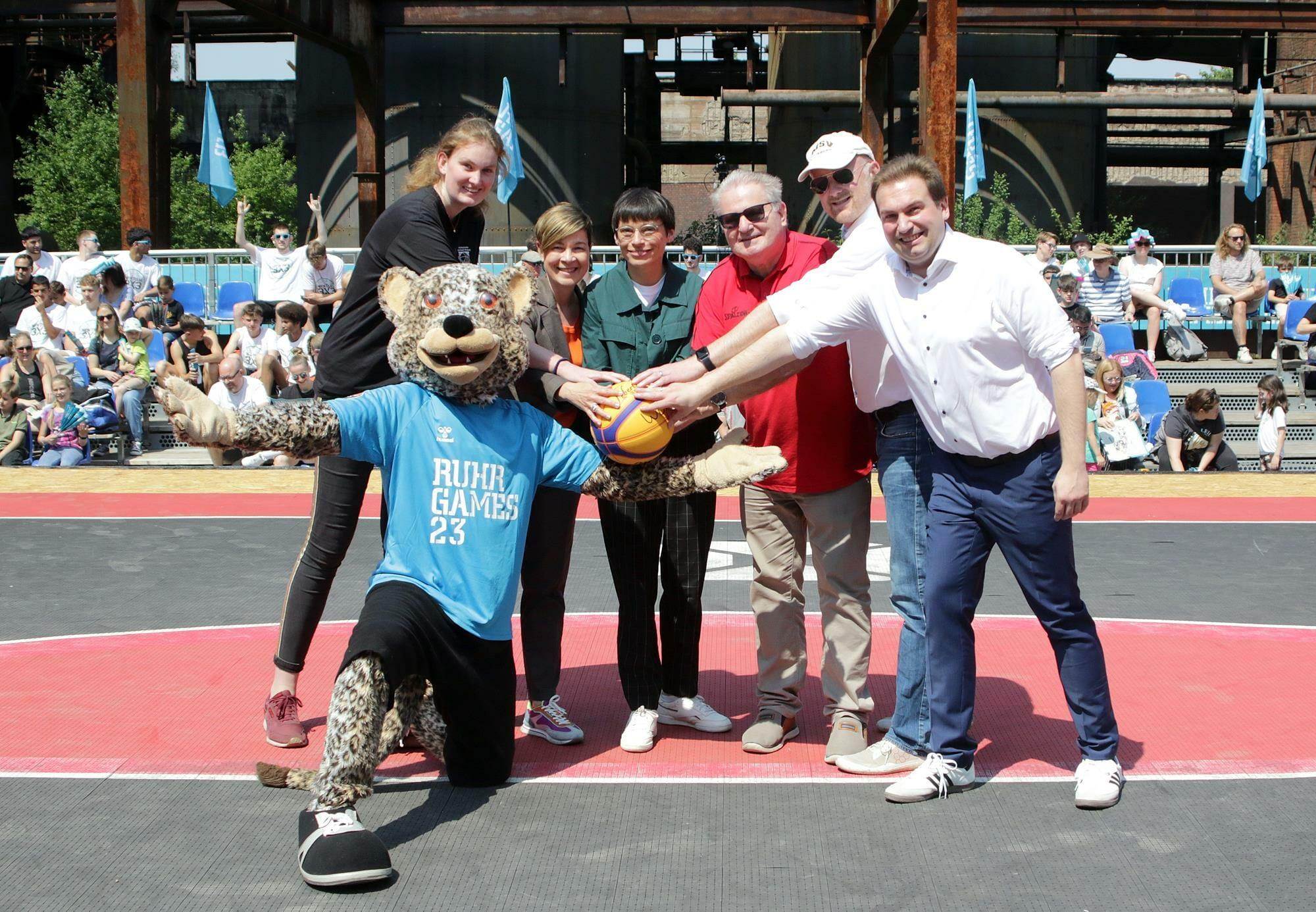 Was für ein Megaevent! 160 Teams auf insgesamt 16 Courts spielten bei der NRW3x3Tour 2023 in Duisburg zum Auftakt der Ruhr Games 2023. Ministerin, Josefine Paul, vom Ministerium für Kinder, Jugend, Familie, Gleichstellung, Flucht und Integration des Landes NRW eröffnete zusammen mit Oberbürgermeister, Sören Link, WBV Präsident, Uwe Plonka, Wiebke Kröger (WBV Schul-und Breitensportausschuss), Jens Wortmann (1.Vors. SJ NRW), Frau Sabine Deutscher (AOK Rheinland/Hamburg) Mitglied des Vorstandes, die Veranstaltung auf dem Centercourt der Piazza Metallica. Bei den Eröffnungswürfen zeigte sich die Ministerin treffsicher und verwandelte die Freiwürfe. Pünktlich um 12:30 Uhr begann dann die erste Spielrunde auf 6 Courts an der Piazza Metallica und 10 weiteren Courts auf dem Parkplatz vor der Jugendherberge. Die Spiele auf dem Centercourt konnten live über Stream verfolgt werden, die AOK Rheinland/Hamburg war erneut mit dem Speed Dribbler und einem großen Stand vertreten. Abwechslung hatten die Teams in den Spielpausen ausreichend. Tausende von Zuschauern tummelten sich zwischen Foodtrucks, Getränkeständen, BMX, Beachvolleyball, Klettern, Hochsprung,.. auf dem Gelände des Landschaftsparks. Die BG Duisburg-West hatte als örtlicher Partner 15 ehrenamtliche Courtwatcher*innen im Einsatz.